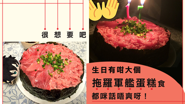 嘩!鮮甜嘅拖羅加上蔥花同醬油嘅點綴,呢個配搭真係perfect池~唔係講笑,真係望多兩眼個巨型拖羅軍艦蛋糕都出晒口水!而呢位網民就話,其實之前都只係講笑咁講話想要個拖羅軍艦蛋糕,估唔到正日生日嗰日真係收到喎,所以真係好實派呀!
