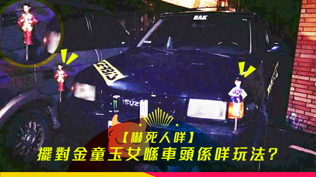 嘩嘩嘩,好擺唔擺,個車主竟然擺對「金童玉女」喺對車頭燈隔籬?乜搵啲咁嘅嘢嚟玩呀……btw,毛毛以為呢位車主擺對「金童玉女」喺車頭已經好嚇人啦,點知原來佢連碌波棍都轉埋做「玉女」喎!