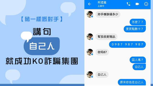 好彩個網民夠醒目,一開波就同佢講暗號:「自己人」,個騙徒又信到十足十,諗住有錢齊齊搵,問網民一唔一齊食大茶飯,仲打算去搵佢面對面慢慢傾呀!