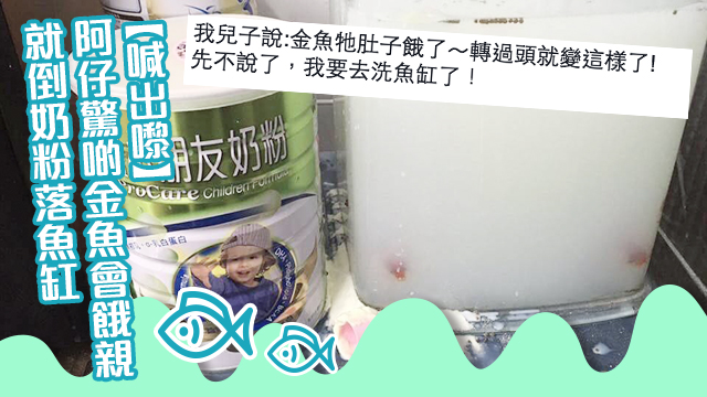 作為一個盡責嘅主人,照顧好寵物嘅起居飲食是常識吧!而有位台灣小朋友就深明呢個大道理,佢見到屋企啲金魚口擘擘、好似好肚餓咁,就即刻將自己平時食開嘅奶粉開心些牙畀啲金魚食喇……咦,不過點解眼前突然白茫茫一片,唔見晒啲魚魚嘅?