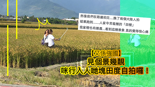 話說,最近有台灣網民去台東伯朗大道踩單車嘅時候,就咁啱遇到班強國遊客。老老77,個景咁靚,有咁多人嚟嚟朝聖都好正常嘅,咪你有你打卡,我繼續我遊山玩水囉。點知呢位台灣網民喺路邊一影完相,佢就見到有兩個強國妹豬行咗入人哋塊田度自拍……話時話,踩住人哋辛辛苦苦種出嚟嘅農作物影相係咪會型啲㗎?