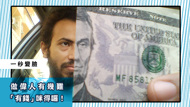 呢位師兄就係喺架車度思考人生嗰陣,領悟到呢個真理,佢竟然發現只要有五蚊美金,就可以變林肯喇!佢一拼落去,何止面型,連髮線同鬍鬚都perfect match! 莫非佢好似tbb劇集咁,終於發現自己係失憶嘅不死人林肯?