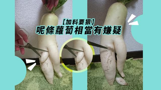 咁有嫌疑,身都唔使轉,直接一嘢剪落去啦!嗱,切咕菇……呀唔係,剪蘿蔔嚟講呢,就要好似燦神講嘅咁,貼住個根部砍落去,仲有最緊要就係夠狠心!