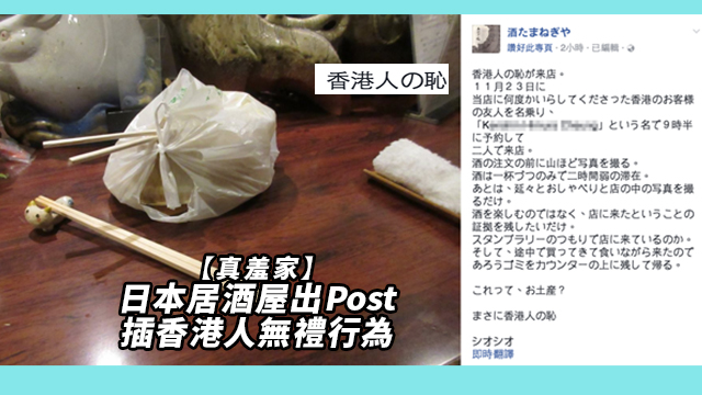 今日下晝兩點,有日本居酒屋「酒たまねぎや」店主就喺facebook page度投訴,話有香港遊客嚟到淨係叫咗一杯酒就坐成兩粒鐘,而且兩個鐘頭內都不斷影相,好似淨係為咗打卡先嚟咁,令店主覺得不受尊重。唔止咁,佢哋走嗰陣仲留低垃圾要店主清理?!