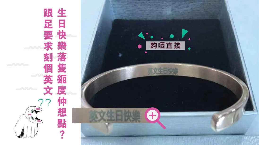 刻成點呀,睇過?咦,點解會喺中文字嚟嘅?睇真啲,原來舖頭直接刻咗「英文生日快樂」六隻大字落隻手鈪度呀……