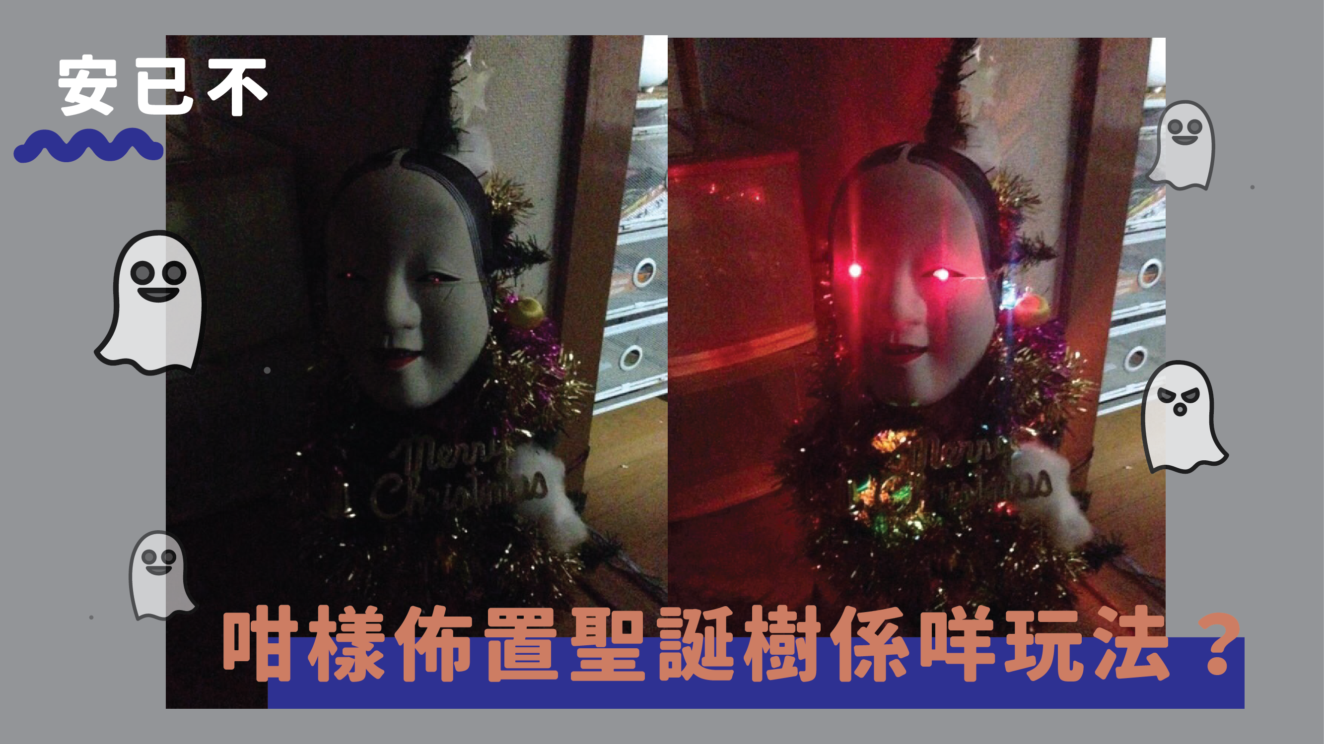 嘩,想嚇到人個心都離一離咩!呢位日本網民竟然將個陰陰嘴笑面具當裝飾咁掛上棵聖誕樹度喎,而且當佢開著啲燈飾之後,咁啱仲有兩粒紅色燈膽仔喺面具對眼嘅位置?,真係用蔗渣嘅價錢就整得出閃燈乳豬嘅味道呀!