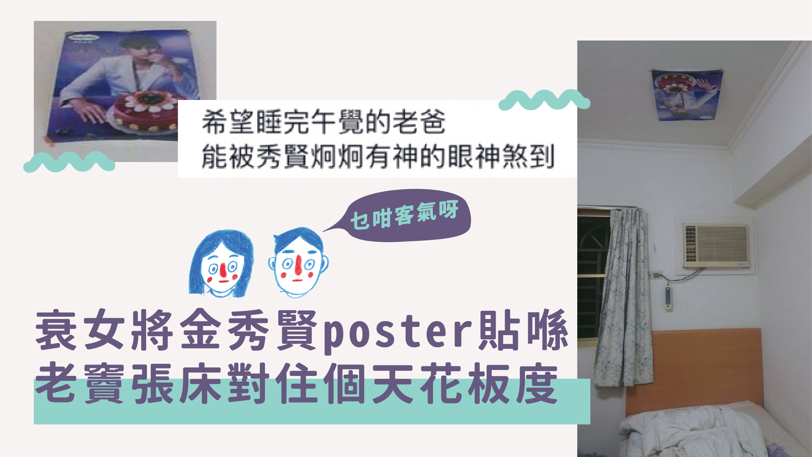 父愛有幾偉大,相信唔使毛毛講大家都知,但毛毛勢估唔到……父愛係偉大到連阿女將張金秀賢poster貼喺自己張床對住嗰塊天花板度都唔介意囉!(PS:呢位老竇絕對唔係金秀賢嘅粉絲)