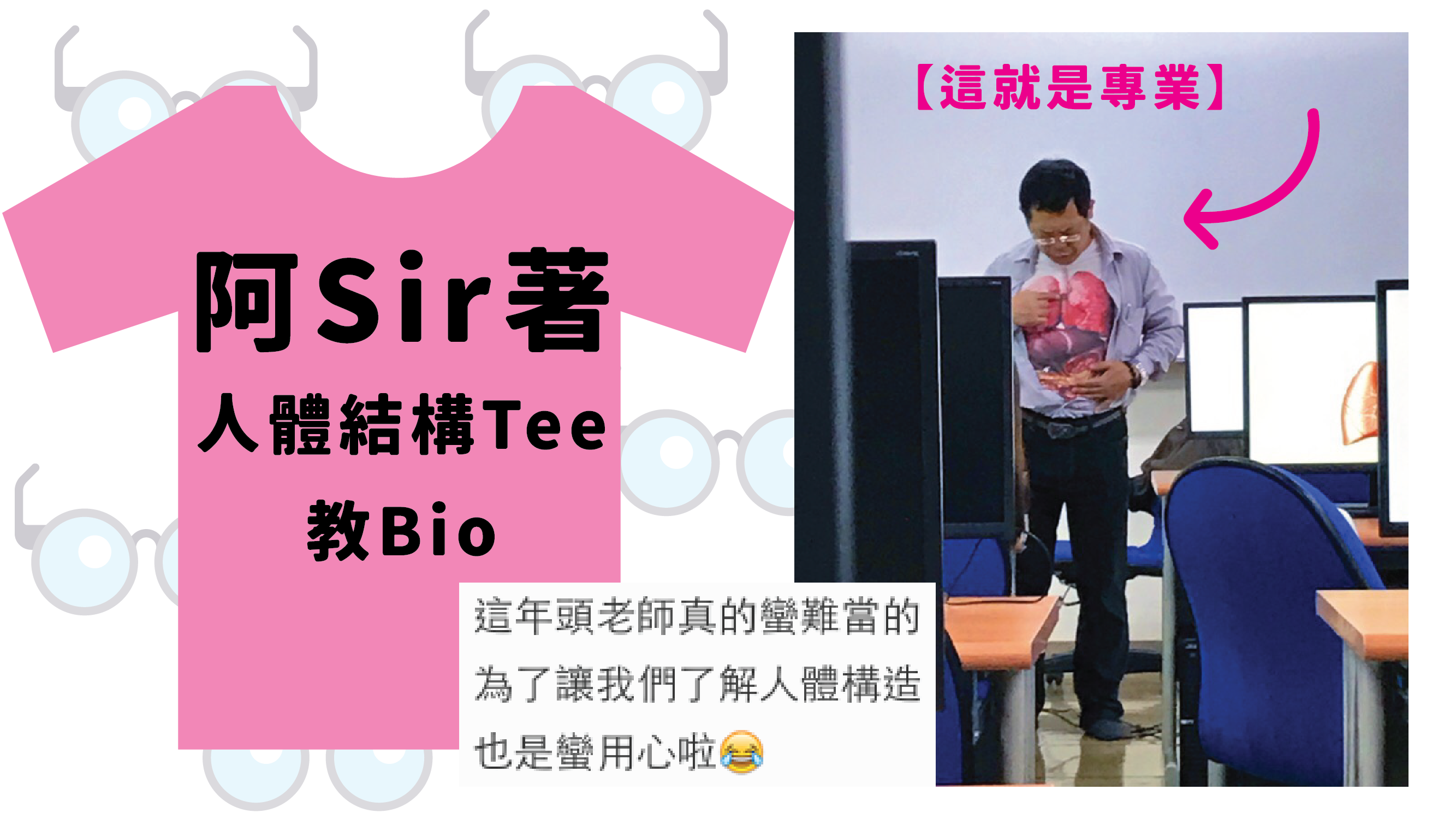 哦,原來佢之所以無啦啦除鈕,係因為佢入面著咗件印有人體構造嘅tee,想生動啲咁用自己個body嚟教bio,等同學仔可以記得入腦啲啫~呢位阿Sir真係用心良苦喇!