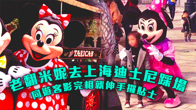 睇真啲~點解米妮好似唔同咗樣咁嘅?原來呢隻咁貪錢嘅米妮笨唔係堅.米妮,佢係由強國人強行扮嘅米妮老翻嚟咋!之不過因為呢隻米妮老翻身處嘅位置屬於免費開放畀公眾嘅area,所以迪士尼先吹佢唔漲咋嘛。嗚哇!喺淘寶買套米妮衫就可以商機無限,諗呢條橋出嚟嗰個真係天才呀!