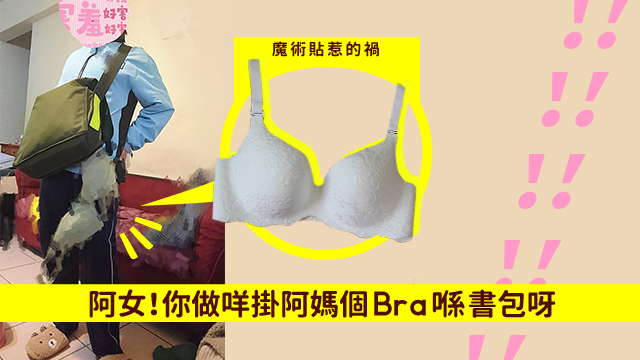 嗱,呢個台妹咪就係眼都未擘得大就要返學囉。就喺佢準備出門之際,阿媽突然截住佢……原來佢連個袋嘅魔術貼黐住咗阿媽個bra都唔知,爭啲就咁掛住阿媽個bra返學呀!呢種貢潮嘅掛法就連阿媽都忍唔住問係咪想用佢個bra嚟做書包吊飾?~