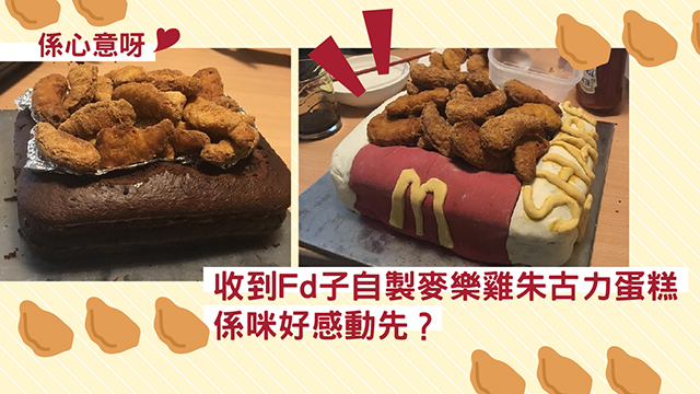 是咁的,呢幾位網民就話,壽星女平時就好鍾意食麥樂雞同朱古力嘅,咁所以佢哋咪將麥樂雞同朱古力溝埋一齊做麥樂雞朱古力蛋糕囉~