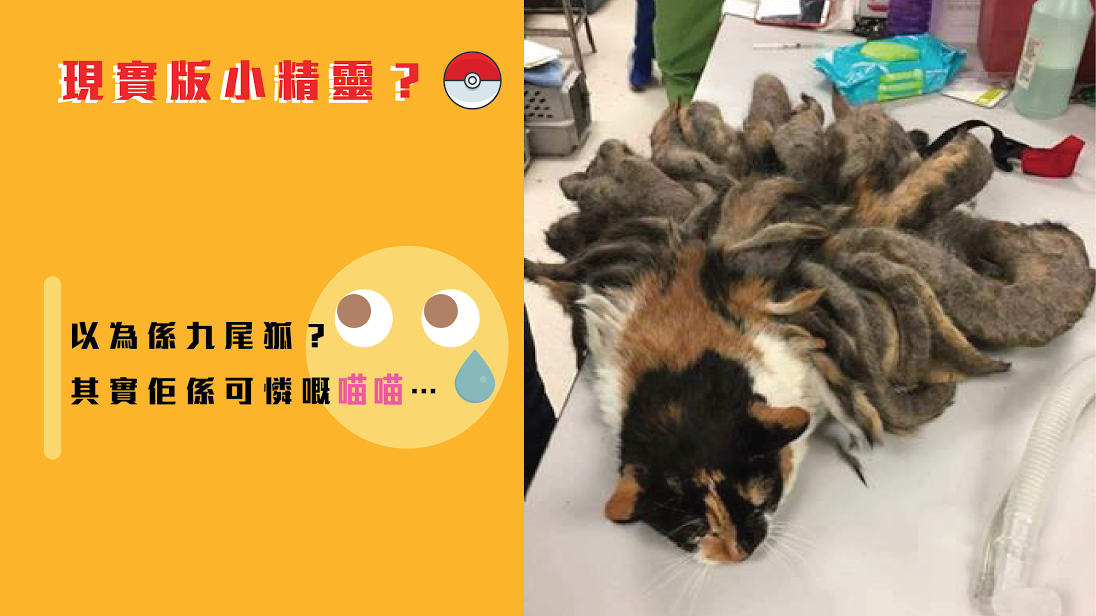 原來貓貓有皮毛糾纏嘅問題,而主人又過咗身,冇人照顧佢,所以啲毛毛繞到好似一條條尾咁喇。貓有九條命就話好啫,有成九條尾咁多,一定覺得好大負擔喇……
