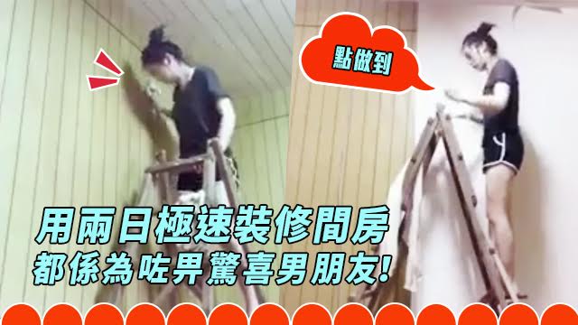 話說個男朋友要去日本表演兩日,女朋友竟然決定偷偷地幫佢間房大翻身,畀個終極大驚喜佢呀!請男朋友嘅爸爸同大佬幫手扔咗張舊床之後,佢就開始爬上梯上面黐牆紙喇!嘩,玩咁大,到底係想迫死邊個!