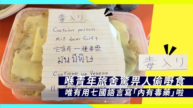點知一山還有一山高,喺專畀背包客住嘅青年旅舍個共用雪櫃入面,竟然出現咗呢張告示!唔知係咪有傻豬豬試過見到雪櫃入面嘅嘢食係旅舍貼心準備嘅所以就食咗呢,有背包客為咗保護自己盒沙律,要出絕招用七國語言寫住「內有毒藥」,日文中文英文泰文甚至你唔識嘅文都寫埋,咁就萬無一失啦!