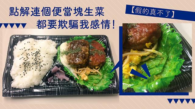 但個網民就食到喊晒口喎,點解嘅?等我哋睇真啲個便當先!唉,真係勢估唔到,原來塊生菜係假㗎,係印落個膠兜度㗎咋傻豬!