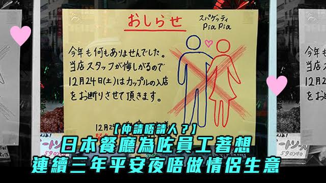 不過做餐飲嘅朋友都幾慘喎,唔似得毛毛對住部電腦就得,話明平安夜,啲情侶湧晒出嚟食大餐,真係睇見都眼冤呀!有日本餐廳嘅腦細為咗員工精神健康著想,決定平安夜唔做情侶生意呀!張告示仲寫明會送張「賢者之轉生卡」畀平安夜嚟幫襯嘅客人?~