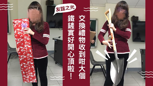 咁到底邊個hihi用鐵鏟嚟當禮物咁送出去咁hihi呢?嗱,之唔係左手邊呢位hihi囉。 Btw,其實交換禮物收到鐵鏟又點吖?正所謂「人生於世上有幾個知己~多少友誼能長存~」,留低嘅,都係一份心意吖係咪?