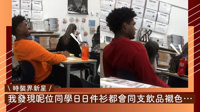 吖,係喇!佢件衫就係同枱面支飲品襯過色呀!話說個女同學有日發現Brian件衫同支飲品同一隻色,就開始留意佢啦,仲日日都偷影佢,默默紀錄呢位時裝界新星嘅掘起喇。