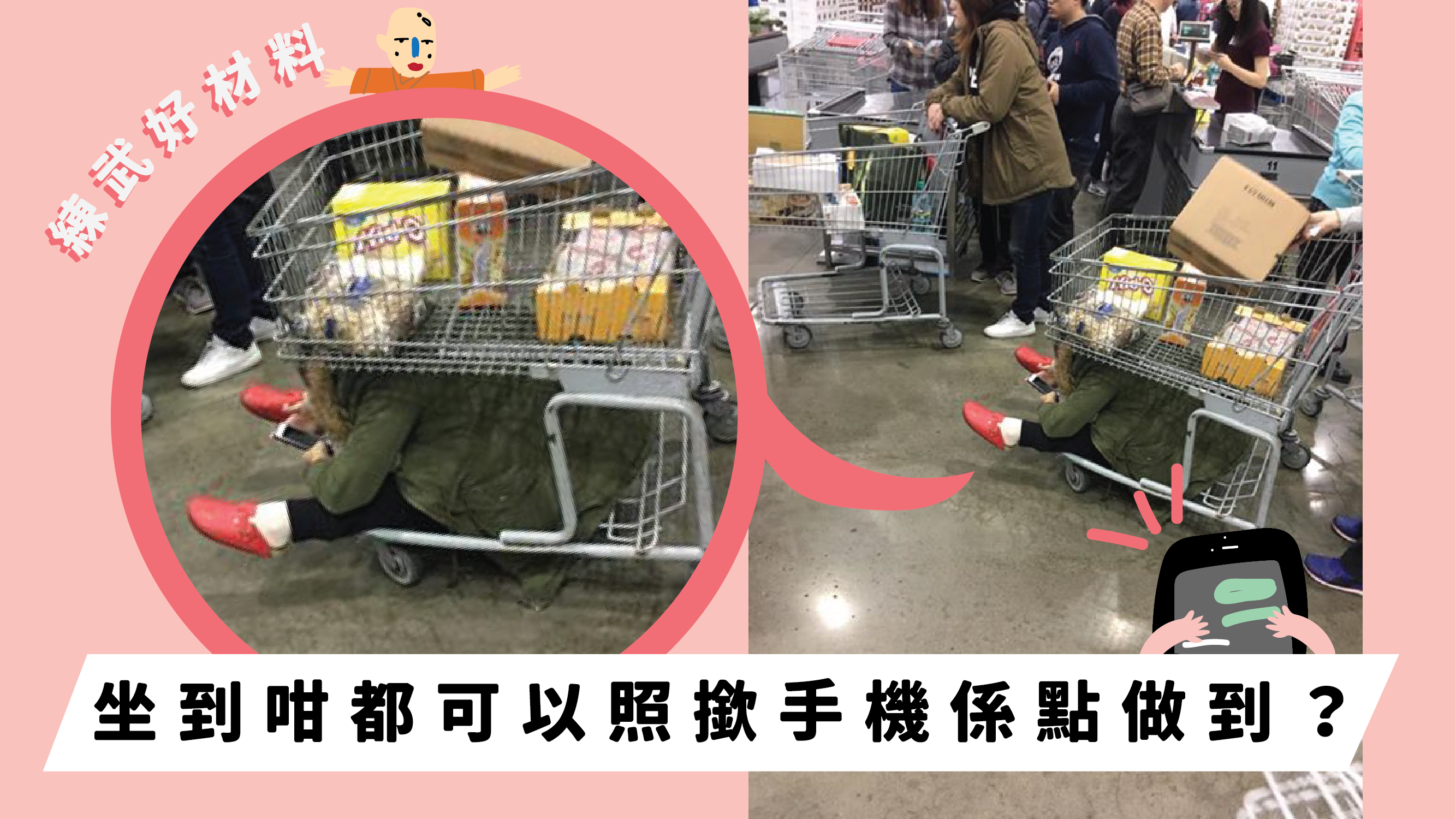 估唔到一個廢青竟然可以將自己成個人收埋喺咁窄嘅手推車下格,仲要照撳手機都冇問題呀下!睇嚟呢位廢青肯肯定天生骨格精奇,係萬中無一嘅練武好材料嚟嘞……老老77,到底你係咪平時跟Do姐跳開鈣質舞,所以啲筋骨先咁軟先?