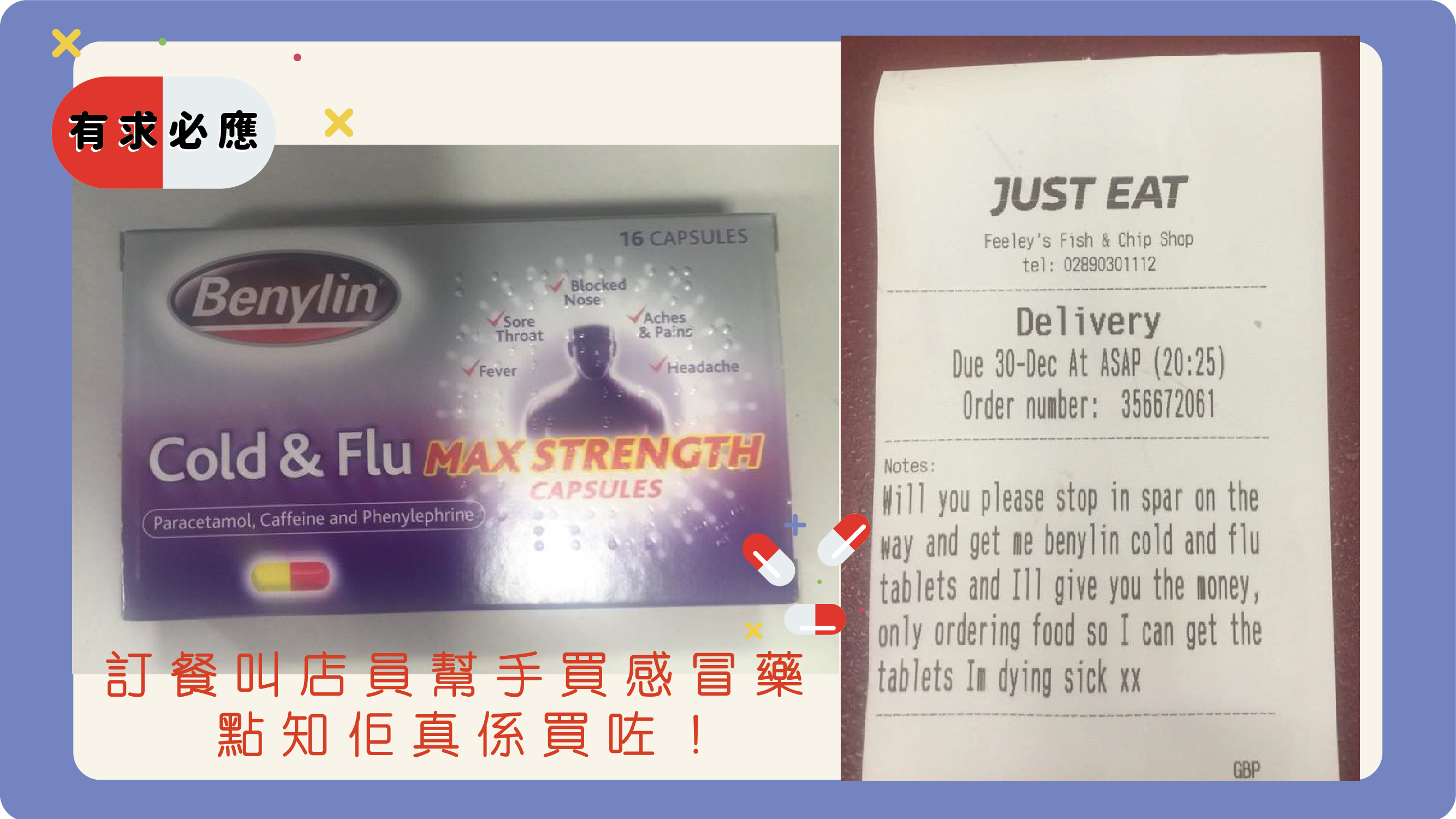 佢喺炸魚薯條店Feeley's Fish and Chip Shop落咗個order,而備註嗰欄就寫:「送餐嘅時候可唔可以順便幫手買盒感冒藥呀?我會畀返錢你。其實我叫外賣都係想要盒感冒藥,我真係病到死下死下咁呀!(以上對話由毛毛9譯)」,希望店員可以幫手買感冒藥畀佢。