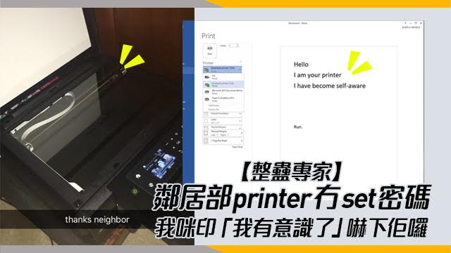 外國有個網民就咁啱發現佢個粗心大意嘅鄰居真係冇幫部新買嘅printer set密碼喇,佢唔係想人哋免費幫佢印嘢呀,而係一釣就想釣條大魚,成部printer拎返屋企!第一步,佢連咗線之後,再扮係部printer自己無端端印嘢同人類溝通,話「我開始有自我意識」,嚇到隔籬屋鼻哥窿都冇肉呀!