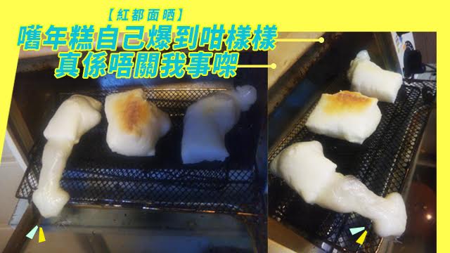 我哋就興蒸或者煎嚟食吖,日本人就鍾意烤到面層燶燶地脆脆地咁食喇,仲要帶少少金黃色,真係諗起都想食返嚿呀!啲年糕燒燒下,入面嘅餡就會開始爆出嚟,燒得愈高愈好意頭㗎!咪住先,左邊嚿年糕……喂呀,食年糕係一家大細嘅活動,你唔好借啲意又畀暗示喎!
