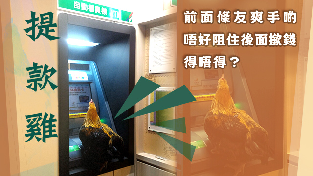 次次去櫃員機撳錢都排晒長龍咁,真係等到粗口都變標點符號。而最近,有台灣網民都遇到一位阻住人撳機嘅hihi喎,不過呢個hihi竟然係……一隻雞?!