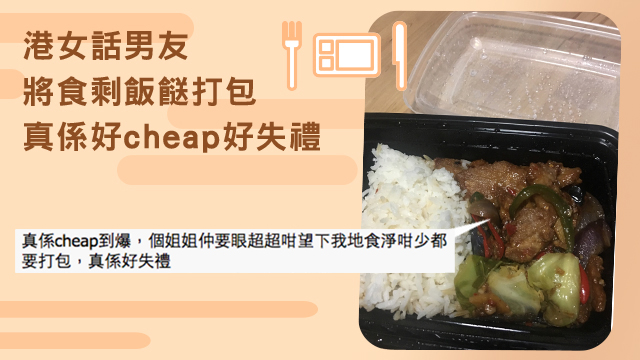話說,最近有位港女就同男朋友喺餐廳食飯,兩個人都只係食咗103蚊啫,而男朋友見呢位港女食剩咗一半咁多,就叫樓面姐姐拎個外賣盒畀佢包起食剩嘅飯餸,等港女第二日可以帶返公司食嘞。點知呢位港女竟然覺得男朋友咁做真係cheap到爆,話好失禮佢?