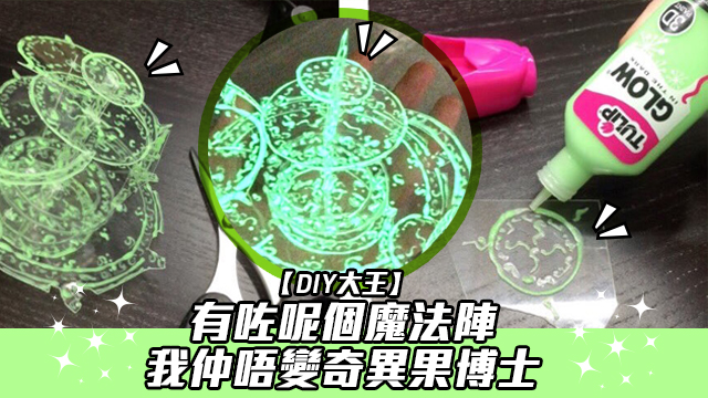 傻豬嚟嘅,原來唔使識魔法都可以有發光魔法陣喺手㗎喇,就係自製一個3D魔法陣喇!材料好簡單,唔係雞蛋六隻同糖兩茶匙呀,係普通嘅透明膠片同埋螢光嘅布繪顏料,只要起個靚稿,再用布繪顏料跟住個稿嚟畫,之後再將啲膠片組合埋一齊就得喇。
