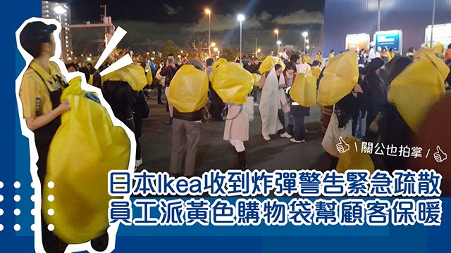 多得一班叻叻豬嘅員工,一知道要疏散就即刻準備定啲氊幫啲客保暖,但係存貨唔夠,點算呀!唔怕,只要動動腦、轉轉彎,咪會快快解決了問題囉~竟然畀Ikea員工諗到派黃色購物袋畀啲客擋風呀!雖然聽落有啲7,但古乳有暈,橋唔怕7,最緊要使得呀嘛~