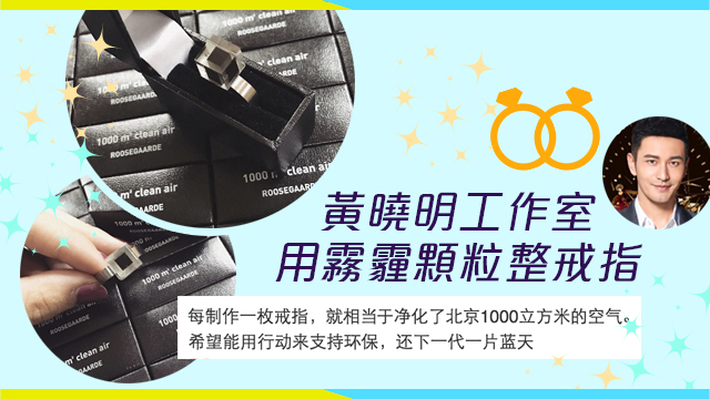 大家唔好睇佢隻嚿膠咁,其實呢隻戒指好有意思㗎,佢上面嗰嚿黑色嘢咪就係用霧霾顆粒製作而成㗎囉。佢哋仲話每整一隻戒指就相當於淨化咗北京1000立方米嘅空氣,實行「用行動來支持環保,還下一代一片藍天」咁話?!