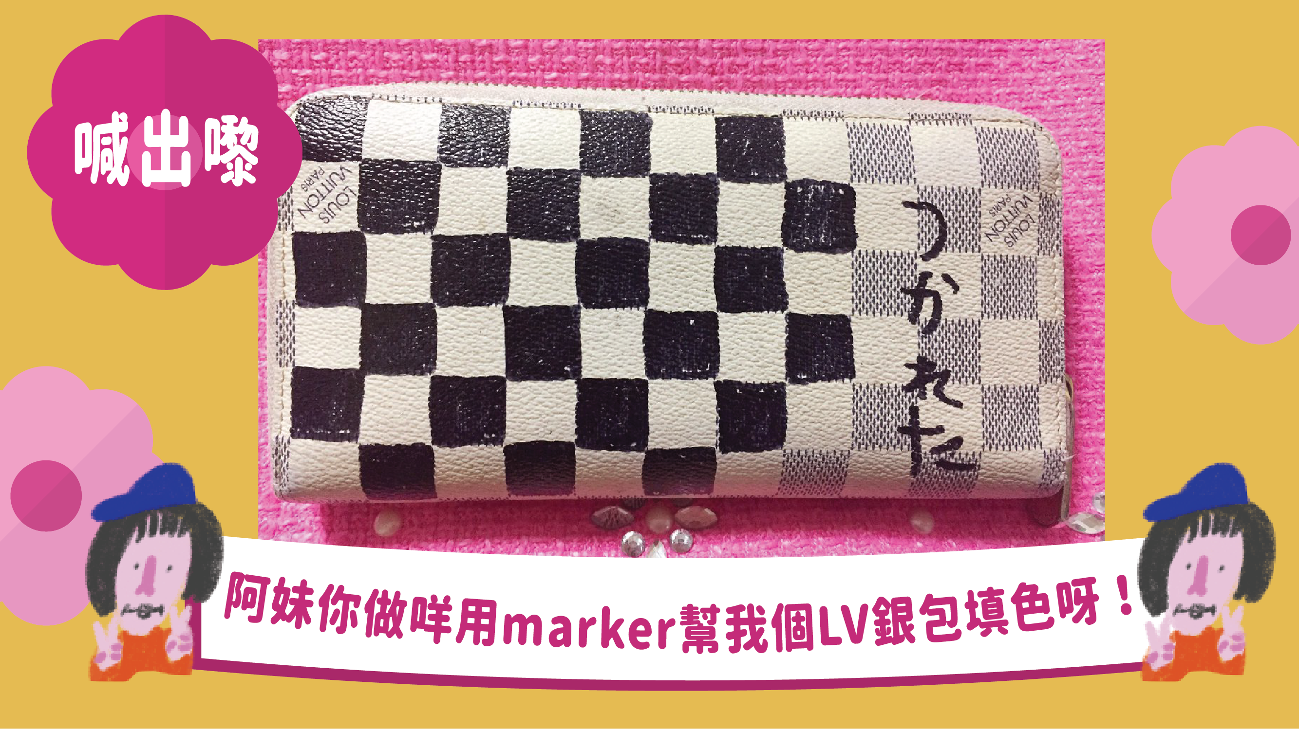 原來佢個讀緊小學嘅細妹因為同家姐嘈完諗住報仇,於是就用marker將家姐個LV銀包上面嘅格仔填滿顏色。不過大家知啦,逐格逐格咁上色又唔可以出界,咁樣髹法好攰㗎嘛,所以佢個小學雞細妹髹到最尾咪放棄咗囉。唉,你放棄都算啦,仲要喺上面寫埋「髹到攰」……毛毛除咗恭喜之外都唔知講咩好喇!