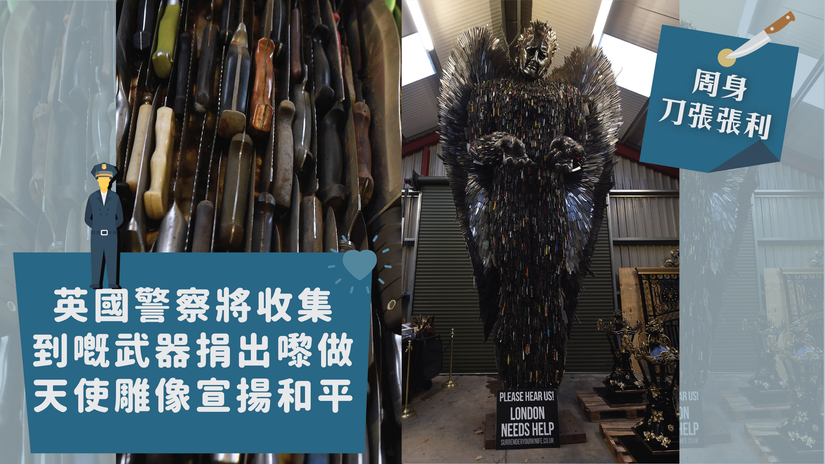 喺英國因為有畀犯人自行繳械嘅棄置箱,所以警察就收集咗好多冇需要留嚟做證據嘅刀嘞。但係佢哋冇掉啲刀,又冇拎去回收,反而選擇咗將呢啲刀送去另一個地方,賦予呢啲武器新嘅Meaning,就係交畀藝術家砌成一個天使雕像喇。