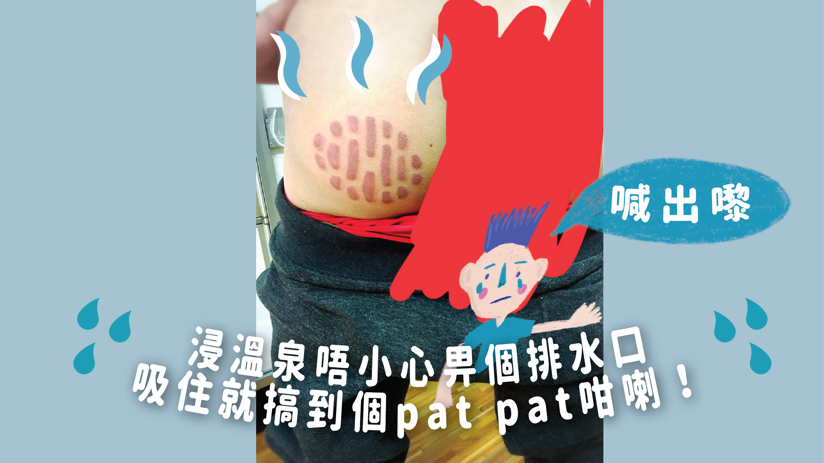 是咁的,話說最近有位日本網民就同佢嘅前輩一齊浸溫泉啦,點知呢位前輩無啦啦發出一聲鄭嘉穎叫.jpg,原來佢個pat pat唔小心畀個溫泉排水口吸住咗,搞到個pat pat留低咗個咁紅印呀!嗚哇,都唔知要等幾多日先散到啲瘀血?㗎,今次真係唔使用計數機都知呢位前輩嘅心理陰影面積有幾大咯……