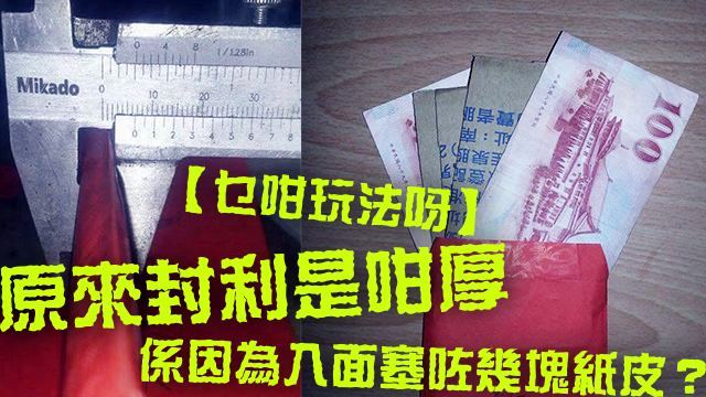 是咁的,話說最近有台灣網民去拜年嘅時候就收到一封厚厚嘅利是。經佢用尺度過,封利是仲足足有成6.5mm咁厚?!佢心諗今次一定爽歪歪啦,點知一拆開封利是先發現原來入面放咗幾塊紙皮,只有最面同最底嗰張先至係真銀紙……即係話佢呢封厚厚嘅利是其實得200蚊台幣(大約50蚊港幣)咋!