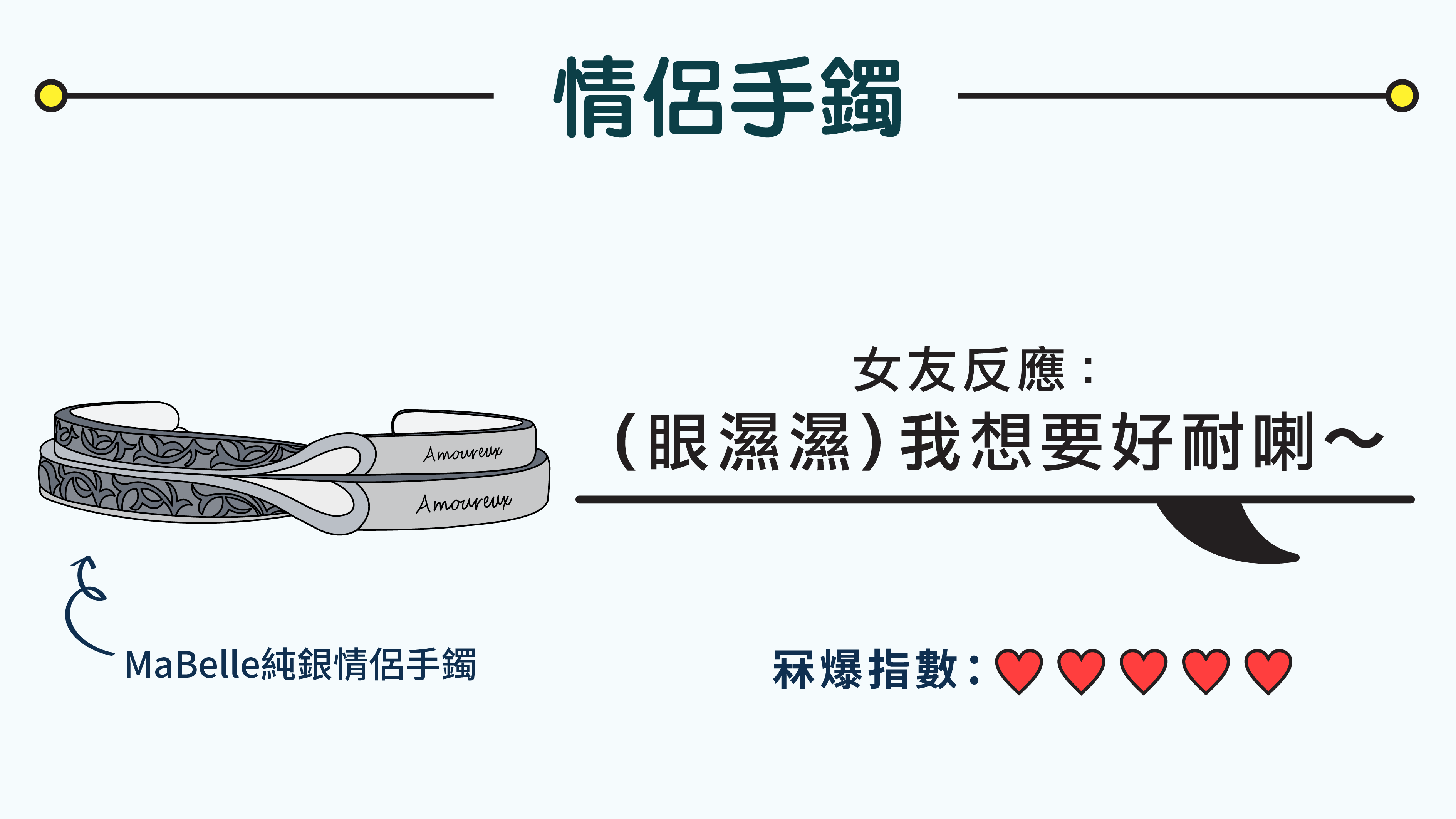 最後啦,咪話毛毛唔教精你!情人節咁浪漫嘅節日,就落啲本氹下女友啦。就好似MaBelle嘅純銀情侶手鐲咁,Fat唇之餘又有啲寓意 ,毛毛係囡嘅話,收到都冧死啦~而且,佢仲送埋一張獨家嘅「DIY短片心意卡」,只要係咁意加幾張相落去就搞掂,慳返唔少時間呀,衰鬼~自稱絕種好男友嘅,咪去