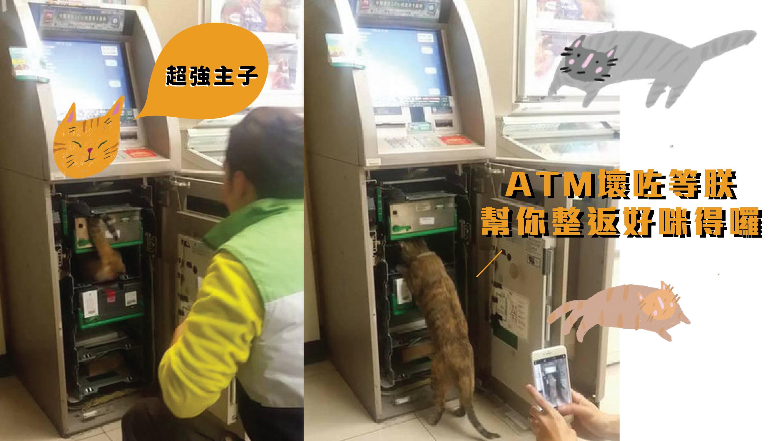 唉,你哋啲奴才,壞咗部提款機就喺度大驚小怪,唔使驚,有朕喺大廳!等主子用佢柔軟嘅身體爬入部ATM度睇下咩事啦!主子深入虎穴,好快就搵到個問題喇~