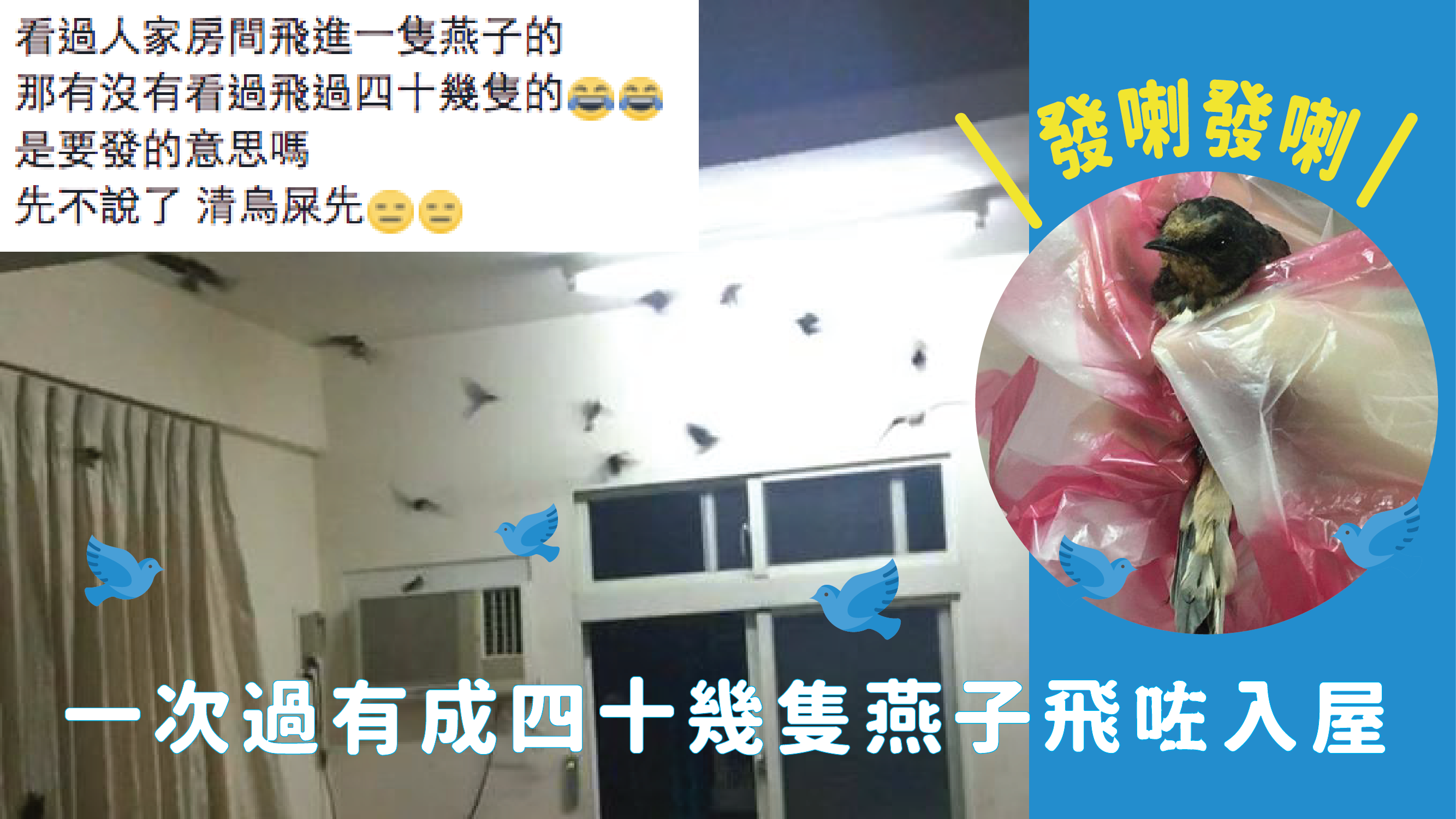 弱弱一問,假如班燕子齊齊喺呢位網民屋企築巢,咁呢位台灣網民咪淨係賣燕窩都賣到金翅發達鳥?any肥,唔理啲燕子會唔會喺呢位網民屋企築巢都好啦,淨係見到有咁多燕子飛入屋呢個景象都知係好意頭啦,證明呢位網民住緊嘅係一塊福地嚟呀!(不過希望呢位網民唔會清雀sss都清到手軟啦…)