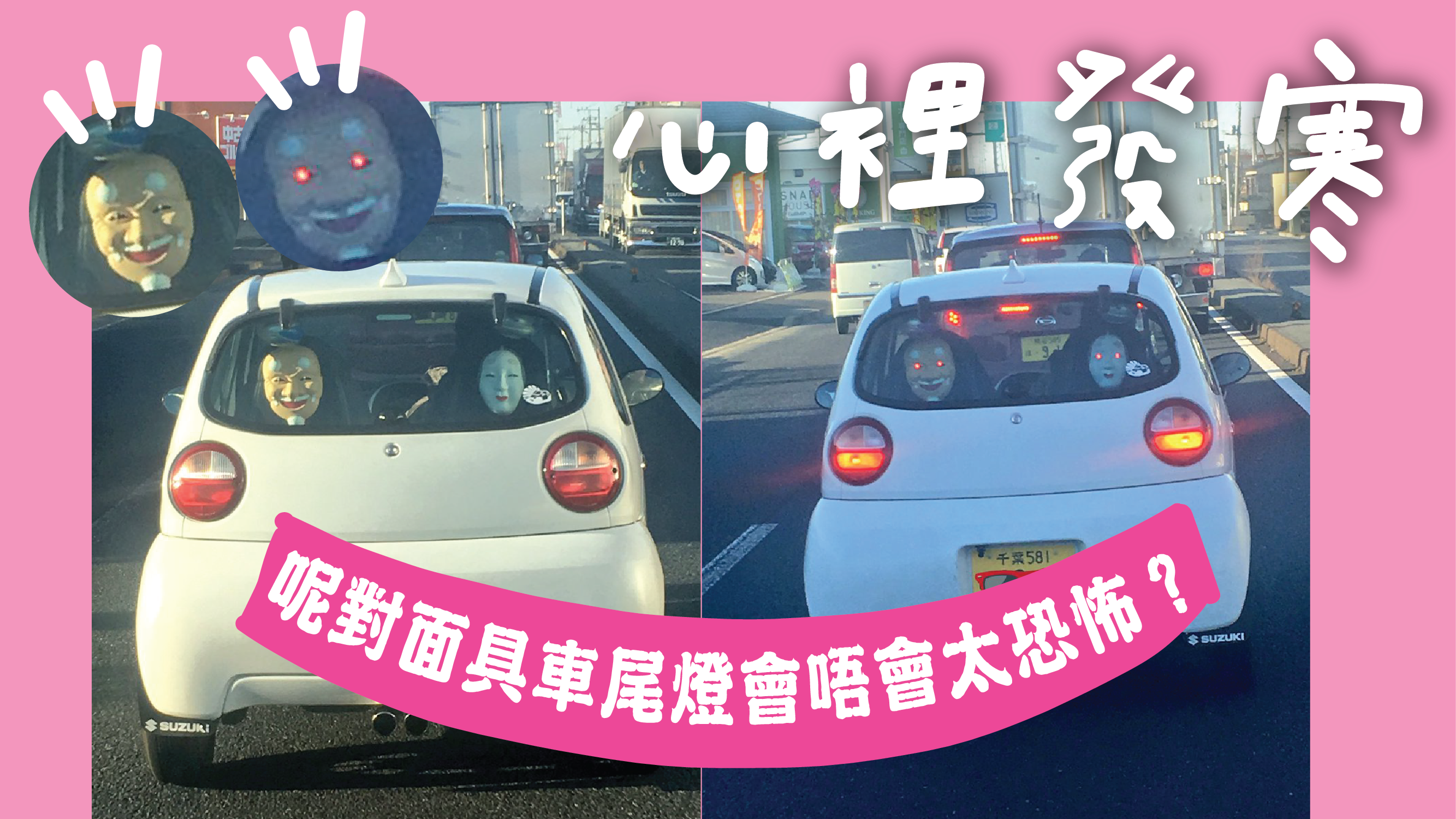 最近,有日本網民揸揸下車嗰陣就發現前面個車主用咗面具嚟做車尾燈喇!咦話時話,如果根據之前班日本網民用面具嚟佈置聖誕樹嘅方法嚟睇,咁呢對面具車尾燈嘅發光位置咪就係佢哋對眼?!