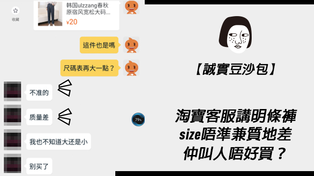 話說,最近有位台妹就諗住喺淘寶買褲,但因為佢今次係第一次淘寶,加上佢又聽講呢間淘寶店啲褲嘅size有偏差嘅關係,所以咪想問清楚先買,費事中伏囉~(雖然問咗都唔代表唔會中伏…)