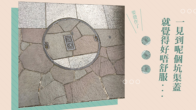 點解命運要咁殘酷?我最唔想見到嘅坑渠蓋竟然咁啱喺呢度畀我見到佢……佢真係好礙眼,好礙眼呀!唉死啦,而家個坑渠蓋喺日本,毛毛又冇錢搭飛機去日本移返正佢,有冇PS大神可以出手幫毛毛移返正佢呀?