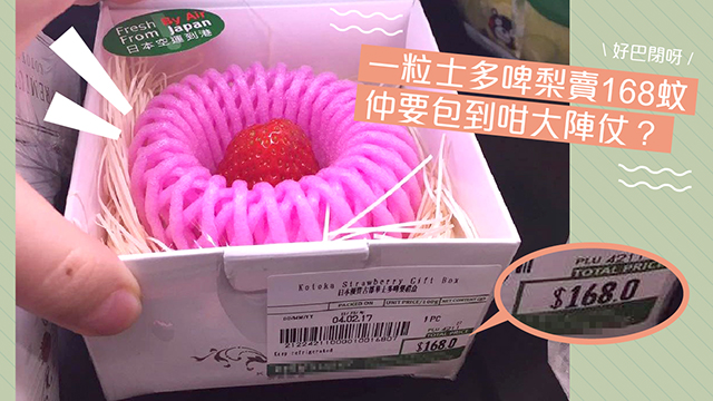 有網民就喺某連鎖超市見到一粒高貴嘅士多啤梨,真係啱晒情人節送畀女神BB做禮物呀!呢粒盛惠168蚊嘅士多啤梨,唔止係日本直送,仲要有成四層保護,又紙盒又保鮮紙又膠網又盛咁,有賊仔想偷食都有排拆先食到,真係好L安全呀!其實粒士多啤梨都唔算貴呀,有人check過,如果真係要喺日本度訂,一粒士多啤梨都真係要過百蚊㗎!用幾十蚊買包裝,真係抵到爛呀!