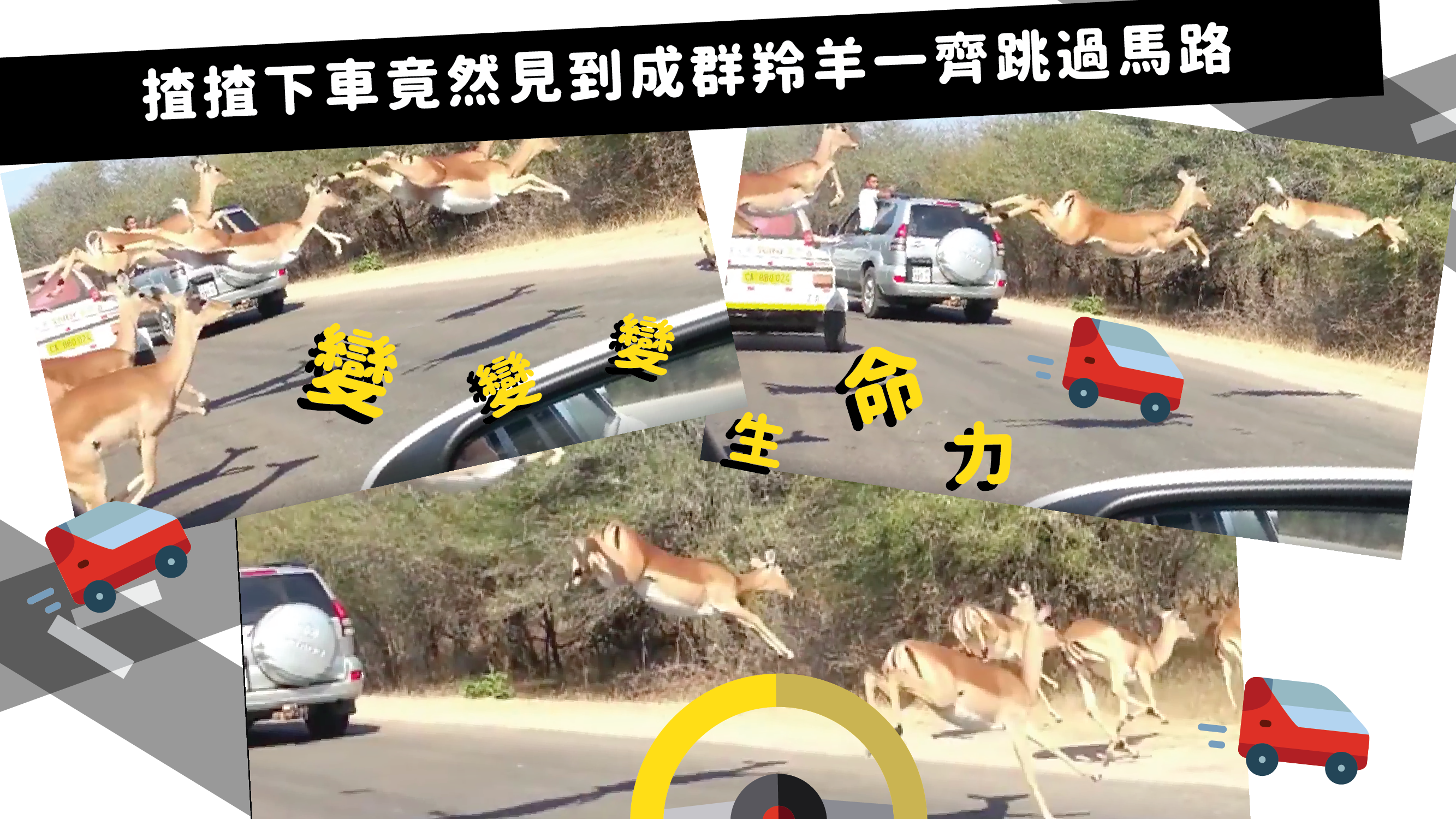 就好似呢位網友咁,揸揸下車就畀佢見到有群羚羊跳咗出嚟喇,啲羚羊突然之間彈入又彈出,真係嚇到心都離一離呀!喂大佬,咪以為你哋唔係斑馬就唔使行斑馬線過馬路,守下交通規則好喎!