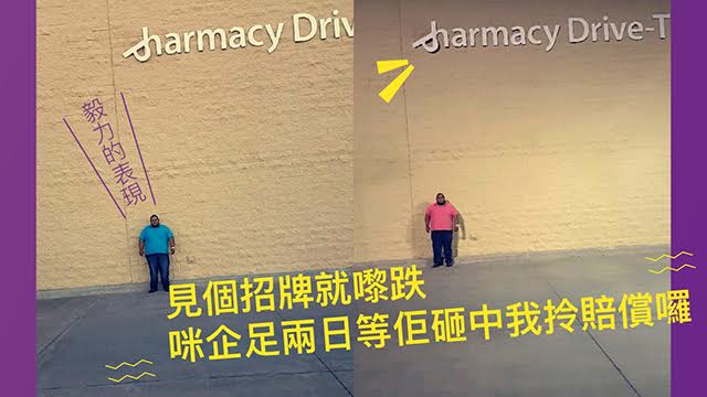 算啦叫極佢都唔會走㗎喇,因為佢係特登企正喺嗰度,搏畀個招牌砸中再拎賠償㗎!見唔見佢連衫都換埋呀,佢已經企足兩日㗎喇,真係毅力與腳骨力的表現呀!