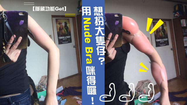 假狗?冇錯喇,就係假狗喇!一於就用女神最愛嘅Nude Bra嚟裝假狗啦,不過就唔係裝喺心口,而係裝喺手臂!遠睇似解剖肌肉圖多過Nude Bra啵!再著埋件衫遮一遮,咪成個大隻仔神還原咗出嚟囉!