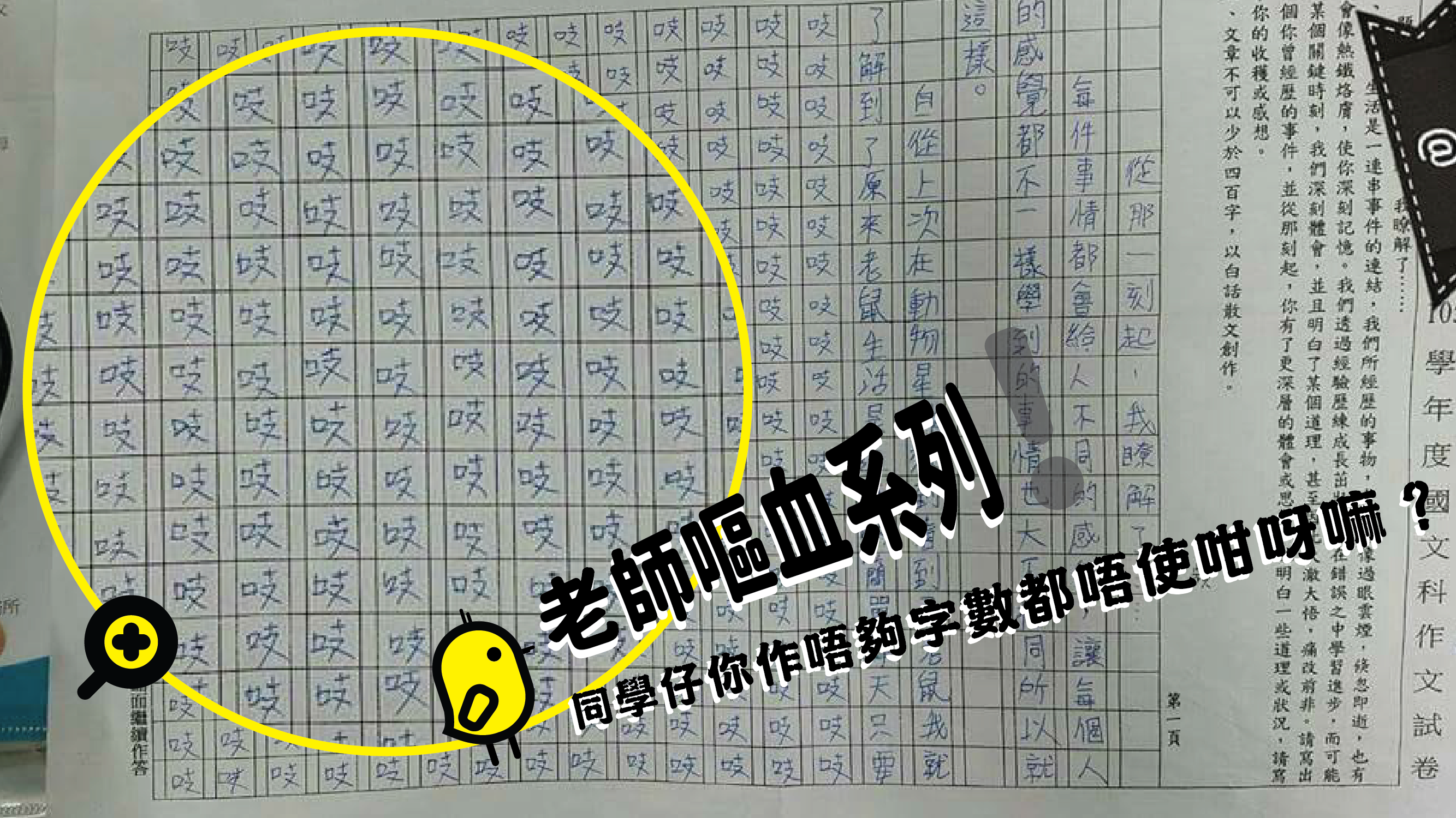 作為一個hea爆嘅學生哥,好多時作文嗰陣都會遇到唔夠字數呢個問題。唔想作文唔夠字數?哦,好簡單啫……要舉例嘅咪舉多幾個例,要形容嘅咪用多幾個四字詞嚟形容囉~四一如四,四四一十六,吹下吹下就吹夠字數㗎啦!再唔係嘅,好似以下呢位台灣同學仔咁又得!