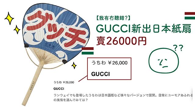 咩話?一把紙扇要成千八蚊,有冇搞錯呀?各位觀眾,我冇講錯你冇聽錯,真係千八蚊呀,講緊嘅之唔係GUCCI新出嘅呢把日本紙扇囉,賣緊26000円,即係1800蚊港紙。木柄上面刻住GUCCI個logo,撥出嚟嘅風唔知係咪會特別涼㗎呢?