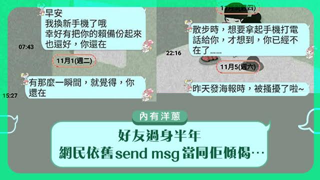 呢個網民嘅好朋友已經過咗身半年,但佢依舊send message畀對方,不時同對方分享生活點滴,講下自己嘅近況,就好似當對方從來都冇離開過,只係一時唔得閒回覆咁……