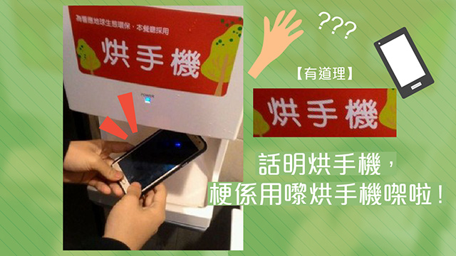 是咁的,話說有網友喺廁所見到有部機寫住「烘手機」三個字,於是咪拎部手機埋去烘囉……嗱,我唔係文盲,我識字㗎,呢部機寫到明係要嚟烘手機,呢部仲唔係要嚟解決手機濕水問題嘅神器?