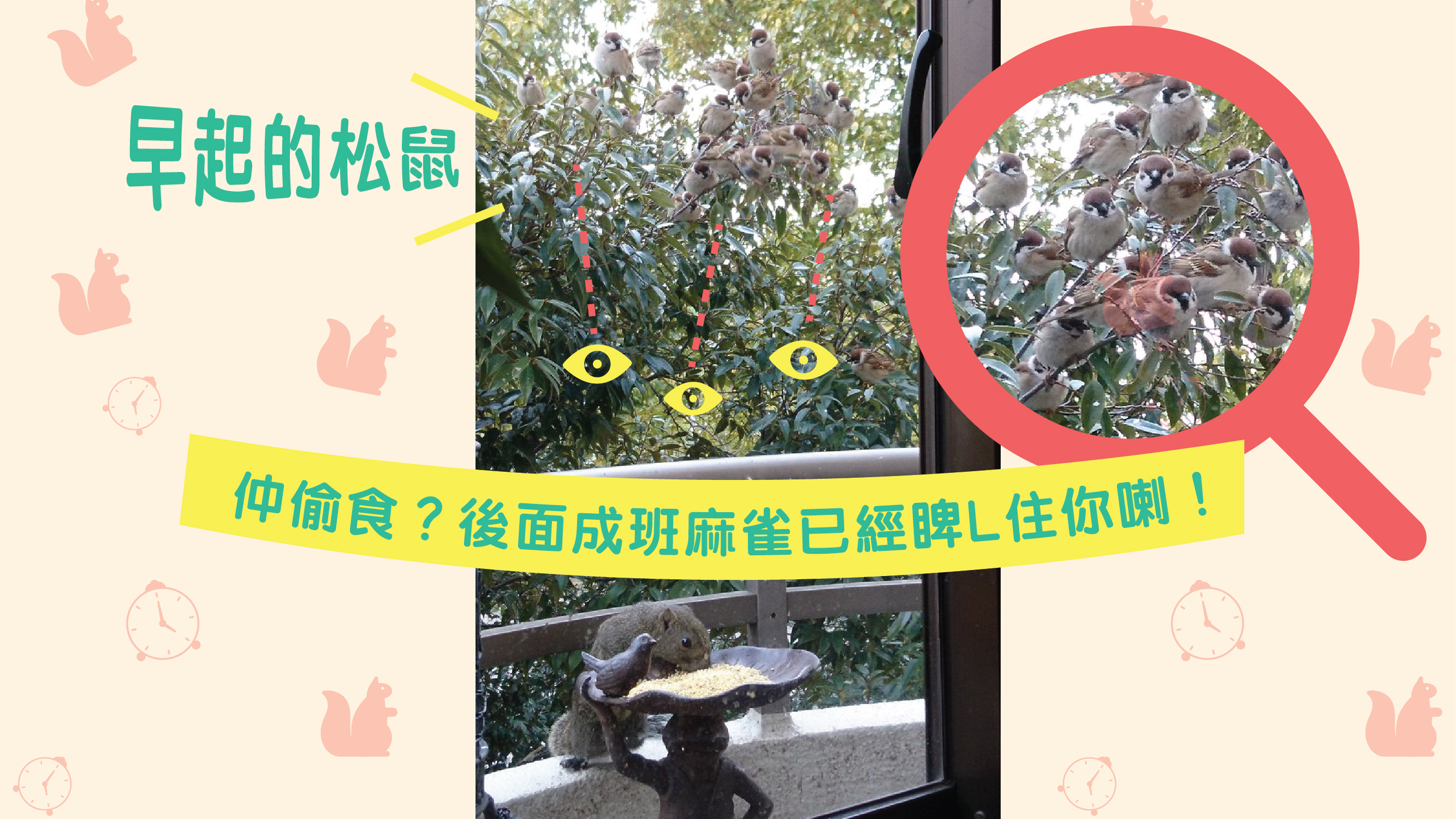 睇真啲,原來有隻松鼠仔喺度食緊佢哋啲雀仔糧呀!